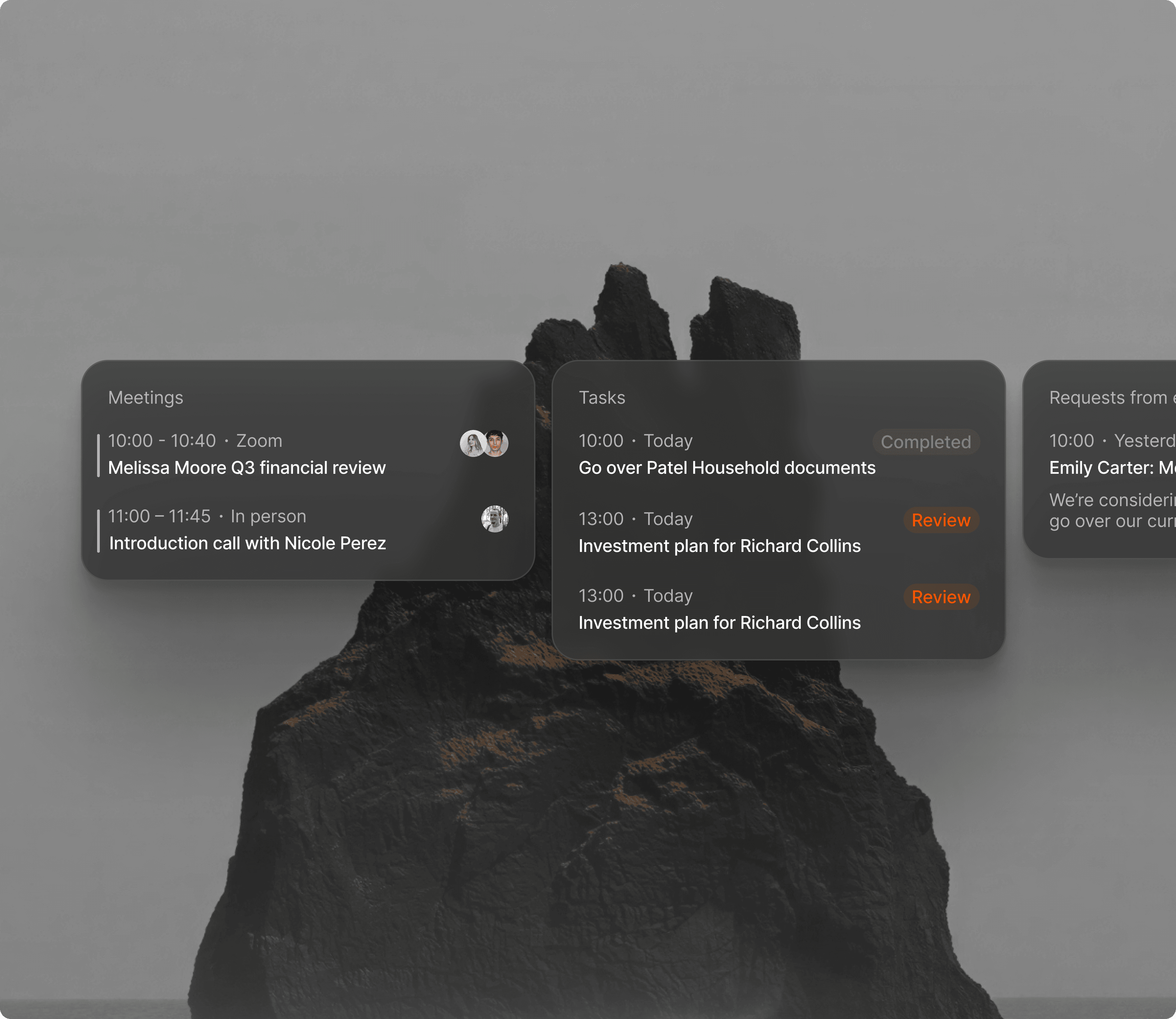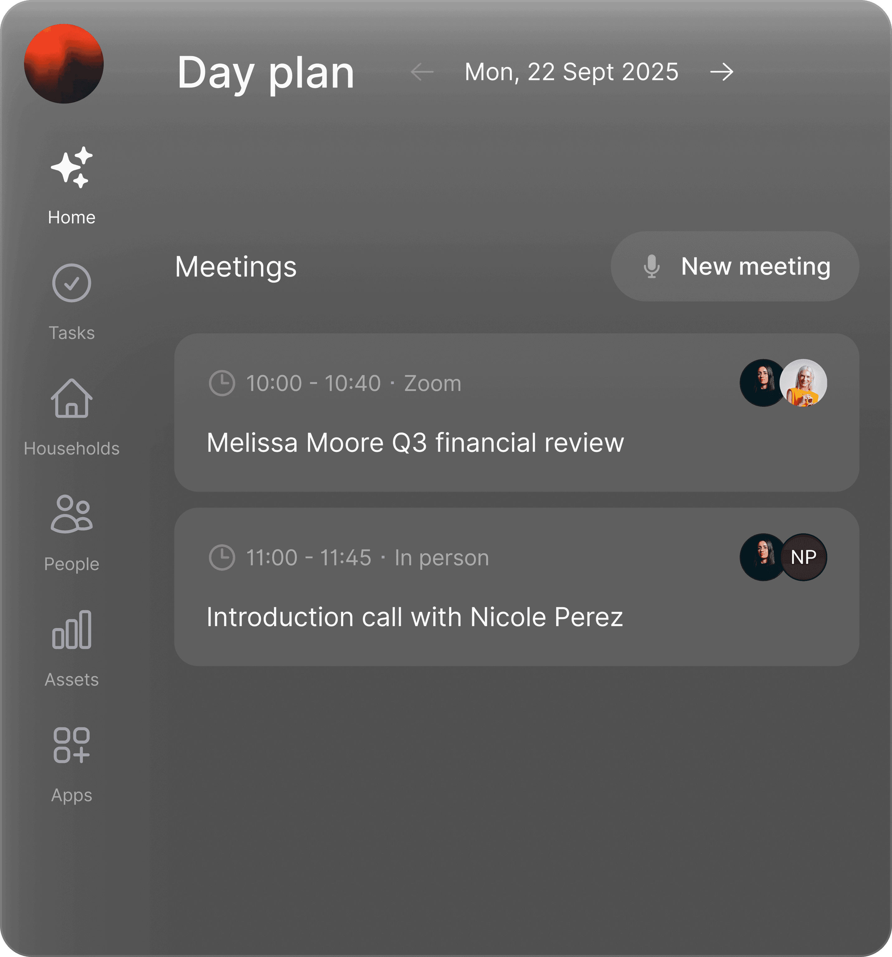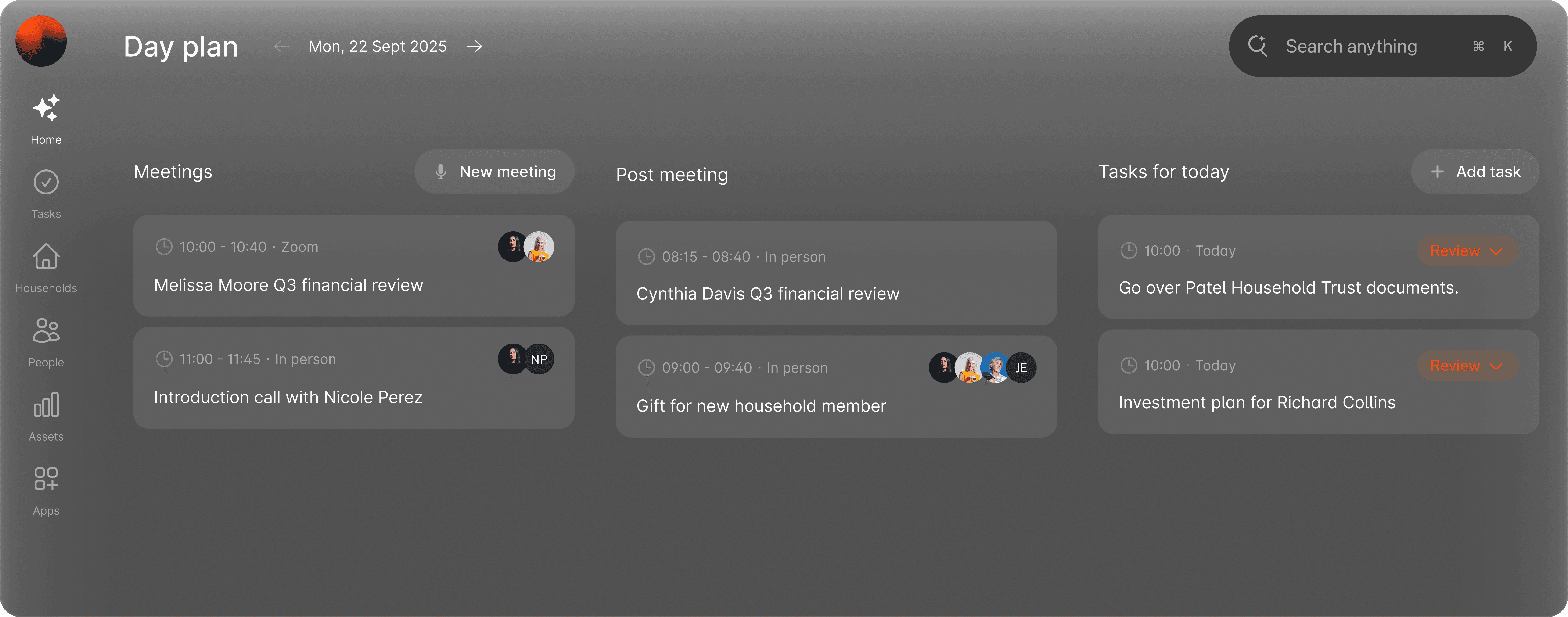 Your command centre for the day. A Kanban-style view that brings together meetings, tasks, and client communications so you always know what needs attention.