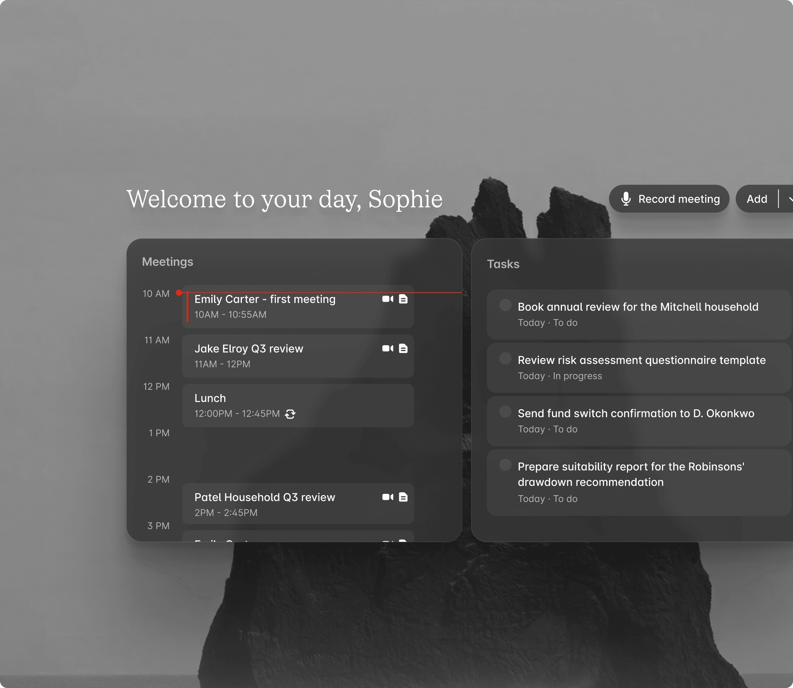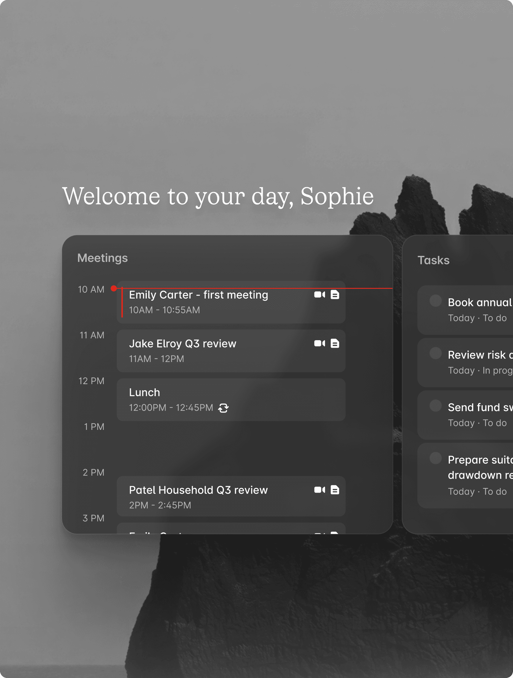 Your command centre for the day. A view that brings together meetings, tasks, and client communications so you always know what needs attention.